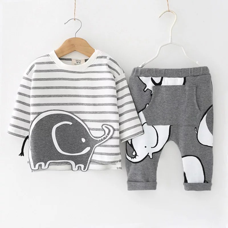 Costum cu imprimeu elefant, confectionat din bumbac, compus din pantaloni si bluza.