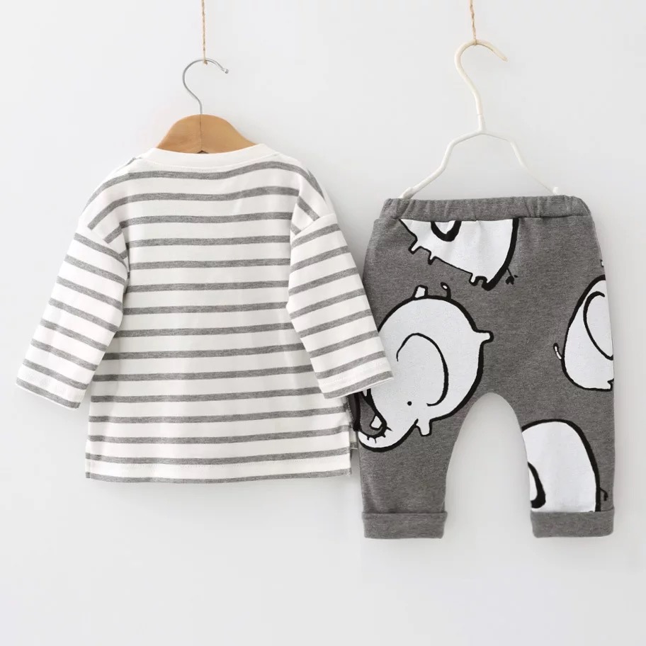 Set cu imprimeu elefant, confectionat din bumbac, compus din pantaloni si bluza. O tinuta casual, care poate fi purtata oriunde in timpul zilei.