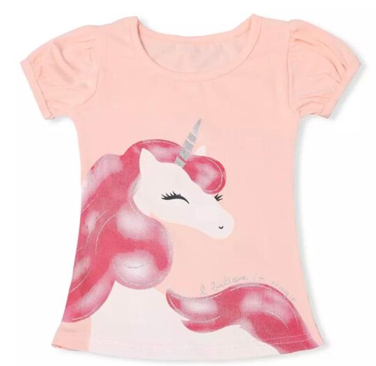 Tricoul unicorn red hair, de culoare piersica, este confectionat din bumbac, avand un deosebit imprimeu cu unicorn si un text discret din glitter „believe in magic”, cu maneci usor incretite, ce ii confera acestuia un aer de eleganta.